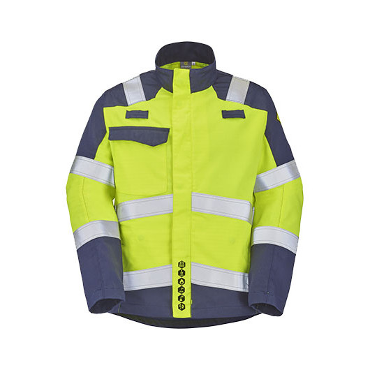 Blouson BLANCAS 260 9D72 8496 de la marque CEPOVETT. Veste de travail ATEX jaune fluo haute visibilité avec bandes retro réfléchissantes. 2 poches basses à double entrée sous rabat pression, 2 poches poitrine sous rabat pressions et 1 poche intérieure. 79% coton, 20% polyester, 1% fibre antistatique, 260g/m².